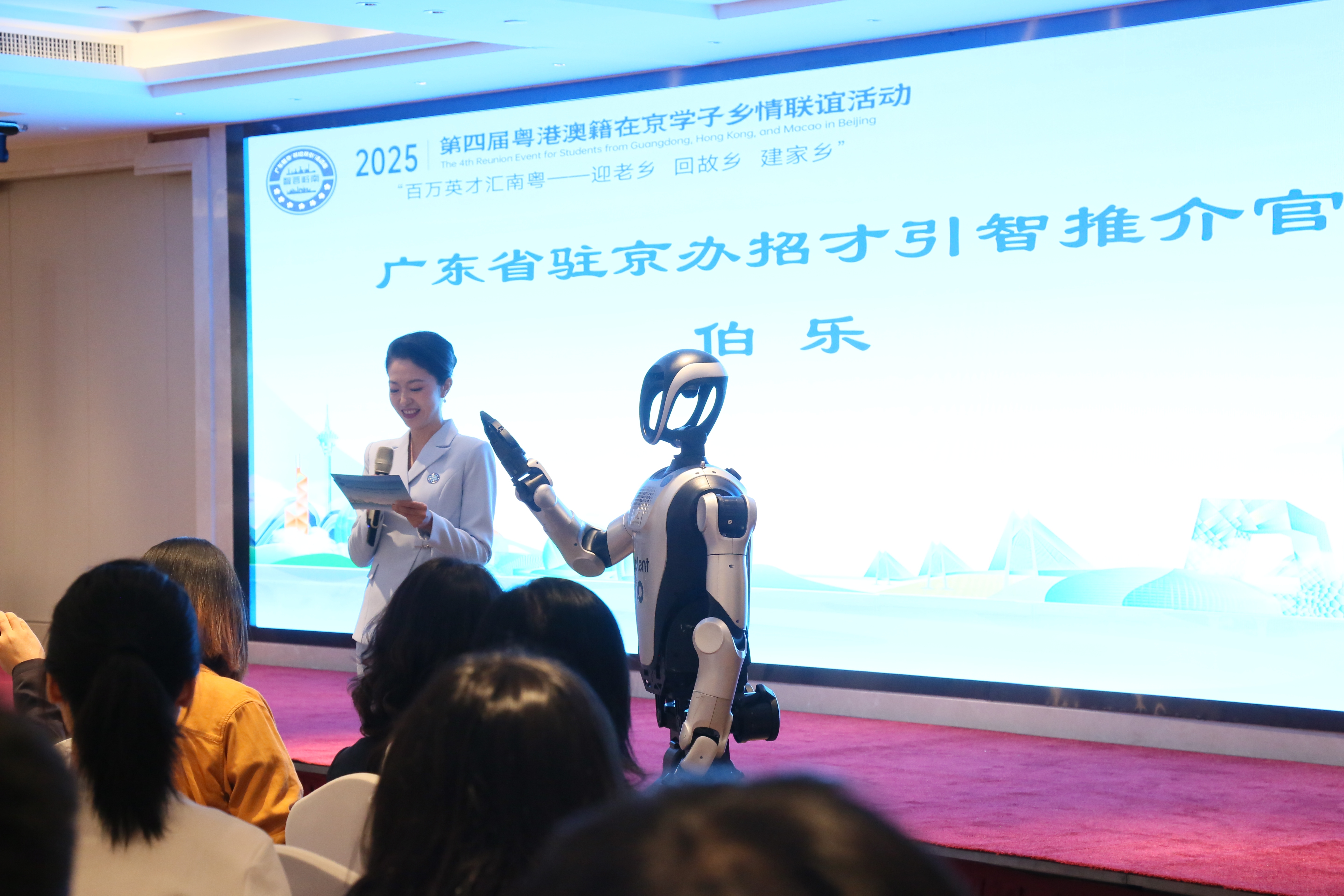 活动中,来自广东的机器人以广东省驻京办招才引智推介官“伯乐”的身份亮相,向同学们介绍粤港澳大湾区青年人才服务体系。现场同学踊跃提问:广东对智能制造行业的就业人员有哪些针对性支持?